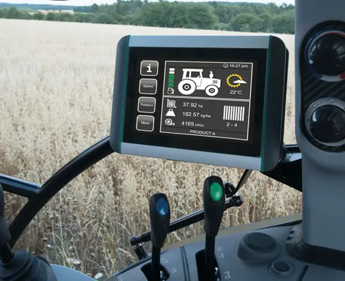 The terminal complies with the ISOBUS 11783 standard and can be used for tractors and self-propelled, mobile agricultural machines. The device has a wide variety of functions, such as machine control and order processing, which are displayed on the large touch screen and can also be operated at the same time. The ISOBUS terminal greatly simplifies the location-specific and targeted management of agricultural land.