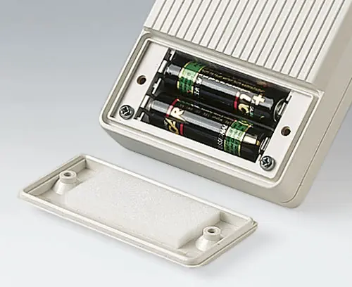 HAND-HELD-BOX N, Vers. I Large exclusive hand-held case. With recessed area e.g. for membrane keyboards, control elements. Battery compartment accessible from the outside with locked battery compartment lid. For 2 x 9 V flat batteries (PP3) or 4 x 1.5 V mignon cells (AA). Cut-out section for digital and analogical modules. Raised front area to accommodate plugs.