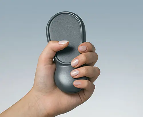 A genuine hand held enclosure that can be held and operated with one hand. Two-part enclosure design. Recessed surface for membrane keyboards. Attachment domes for a PCB in the top part.