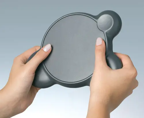 An enclosure that can be held and operated with two hands. Two-part enclosure design with symmetrically positioned gripping areas. Recessed surface for membrane keyboards. Separate recess for special functions. Attachment domes for a PCB in the top part.