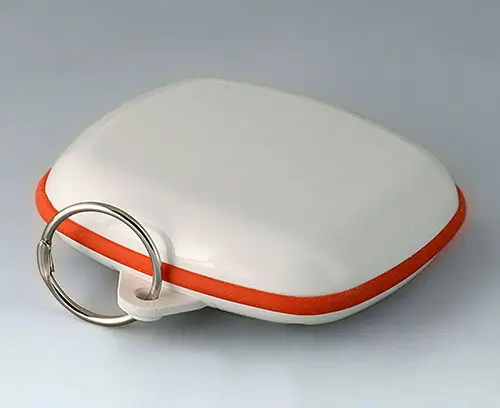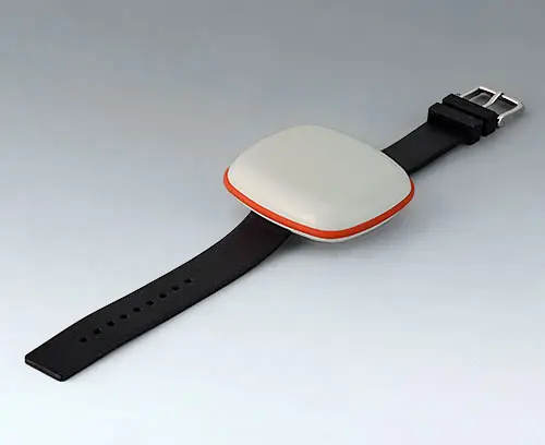 Modern small enclosure specifically designed for "wearable technologies". Three-part design consisting of highly polished top and bottom parts and a matt TPV sealing ring.