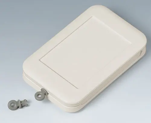 SMART-CASE M, Vers. II Ergonomic handheld case composed of two parts. Location at the front along with a screw in the center of the case. Possiblities for fixing PCBs in top and base part. Polished front area for utmost effectiveness when exposed to infra-red light. Integrated supports for two 1,5 V micro cells (AAA).