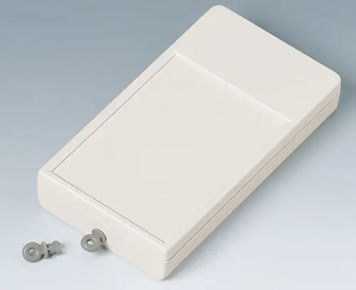 SMART-CASE M, Vers. II Ergonomic handheld case composed of two parts. Location at the front along with a screw in the center of the case. Possiblities for fixing PCBs in top and base part. Integrated supports for two 1,5 V micro cells (AAA).