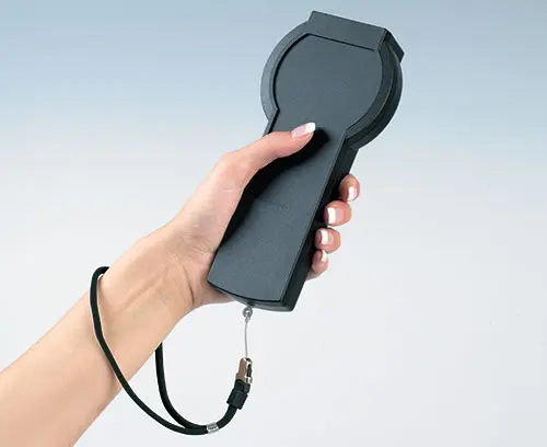 HAND-HELD-BOX P, Vers. I Design: Successfully used case for measuring instruments. With recessed area for imprintings or your logo. Cut-out section for LCD or analogical modules. With battery compartment, accessible from the outside, for 9 V flat battery (PP3) or 1.5 V baby cell (C) with contacts for soldering. Raised front area to accommodate plugs.
