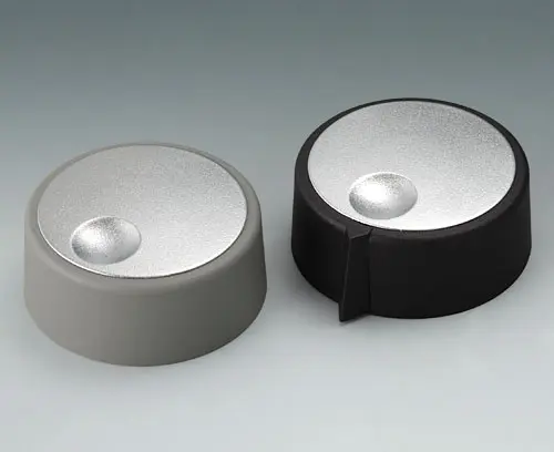 COM-KNOBS 40, with recess Suitable for rotary potentiometer with round shaft ends according to DIN 41591. Collet system for convenient knob assembly from the front. Borehole without chamfer.