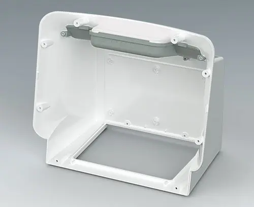 Order with COMMUNITEC S basic housing. Features a recessed area for protecting membrane keypads and integrating large-format displays up to 11.5" (29 cm), with a flat area below for front-mounted control elements and connectors. Includes integrated fastening pillars for PCBs or mounting plates. The operating panel is installed from the rear.
