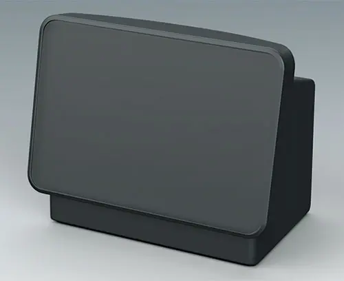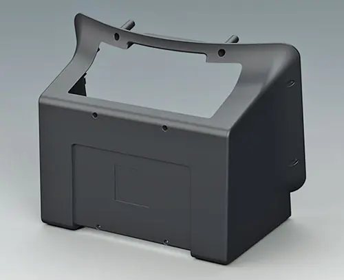 Order with COMMUNITEC M basic housing. Features a recessed area for protecting membrane keypads and integrating large-format displays up to 14" (35 cm), with a flat area below for front-mounted control elements and connectors. Includes integrated fastening pillars for PCBs or mounting plates. The operating panel is installed from the rear.