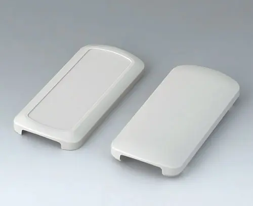 Basic enclosure, 2-piece, with convex and flattened shell. Recessed surface to protect the membrane keyboard, decor foil or label. Both end sides open, and end parts or the cable gland kits can optionally be mounted there (accessories). Four attachment domes for mounting a PCB in the flattened shell. Plastic enclosure snaps together.