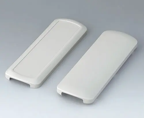 Basic enclosure, 2-piece, with convex and flattened shell. Recessed surface to protect the membrane keyboard, decor foil or label. Both end sides open, and end parts or the cable gland kits can optionally be mounted there (accessories). Four attachment domes for mounting a PCB in the flattened shell. Plastic enclosure snaps together.