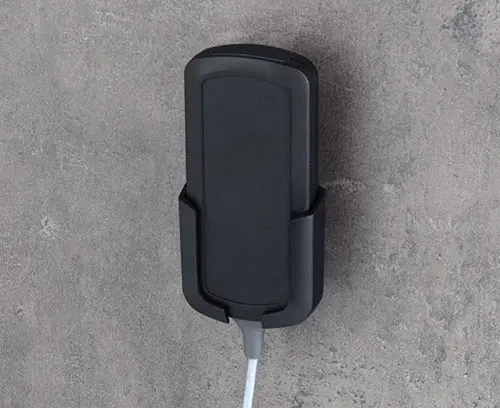 Special holder for CONNECT M for the secure storage of wired and wireless mobile devices. With large recess for plug-in connections. The holder is mounted on the wall or on other components with standard screws with head diameters of 5.5 to 7 mm.