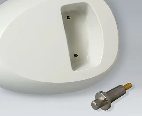Spring contact, round with ballpoint tip and collar for transmitting charging current. Drilled hole necessary, then self-locking. Further contact established by means of a soldered stranded wire on the fixed outer surface or PCB mounting. Load-carrying capacity up to 3 A. 1.5 mm stroke, 0,3 N. Extremely low contact resistance.
