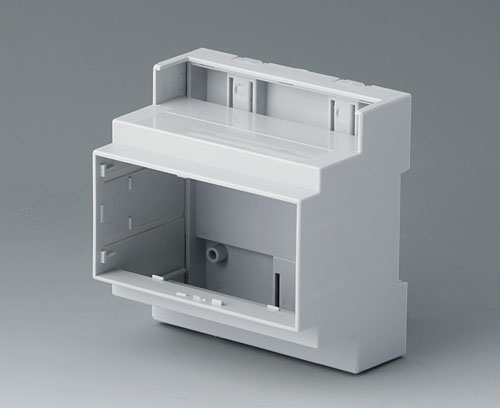 RAILTEC C, 6 modules, Vers. II Enclosure with 1 side open for connection - for max. 2 terminal guards (accessories). Fast and simple locking capability onto DIN EN 60715 (TH35). Bottom part with fastening pillars. Vertical and horizontal guides for assembling the PCBs. Easy assembly through snap-in installation of the case parts.