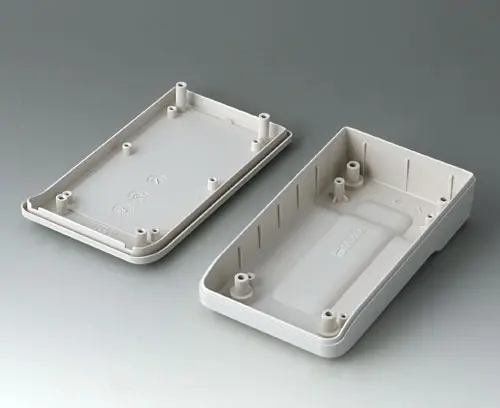 2-part compact hand-held enclosure with an ergonomic, robust design. Secure grip through finger recess in the bottom part. Recessed user area to protect the operating elements. Attachment domes for PCBs and components in the top and bottom parts.