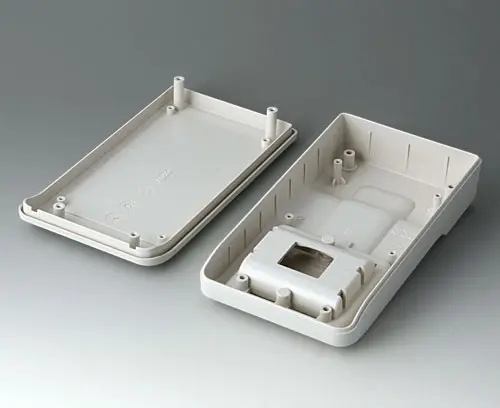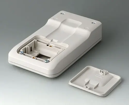 3-part compact hand-held enclosure with an ergonomic, robust design. Ideal for miniaturised electronics applications. Secure grip through finger recess in the bottom part and centre of gravity near the body. With a battery compartment, accessible from the outside, for 3 x 1.5 V AA batteries. Recessed user area to protect the operating elements. Attachment domes for PCBs and components in the top and bottom parts.