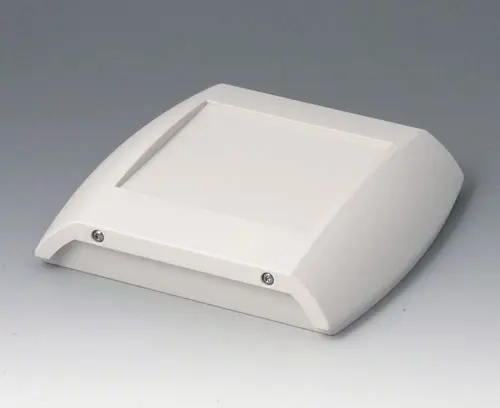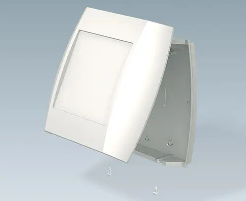 Two-part case. The bottom part can be fixed directly to the wall, the top part is fixed by Torx T10 stainless steel screws from above or below. Recessed operating area to protect the membrane keyboard. Fastening pillars in the bottom and top part. Integrated battery compartment for 2 x AA.
