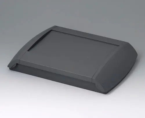 Four-part case. The bottom part can be fixed directly to the wall, the top part will be assembled by means of screws from the front. 2 side trims close the case. If required, the trims can also be locked, thus preventing unauthorised access. Recessed operating area to protect the membrane keyboard. Fastening pillars for PCBs in bottom and top part. Integrated supports for 2 x AA / 1 x 9 V.