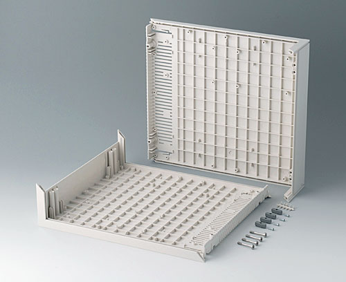 MEDITEC D 220, without handle bar Complete case. Ideally suited to accommodate double-Eurocards 233.4 x 220 mm. Two identical shells are joined together so that they overlap. Side trims easily fitted. Non-slipping case feet are fixed by screws to ensure a firm and stable support.