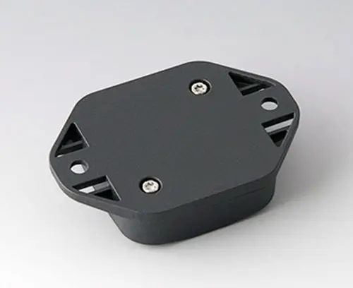 2-part plastic enclosure with flat top part. Bottom part with integrated flanges for fast wall mounting or for mounting on rails and tube profiles or on masts. Robust design with proven tongue and groove connection. Assembled with Torx stainless steel screws. Fixing supports for PCBs and components in the top and bottom parts. Fastening on the supports is by means of hot caulking.