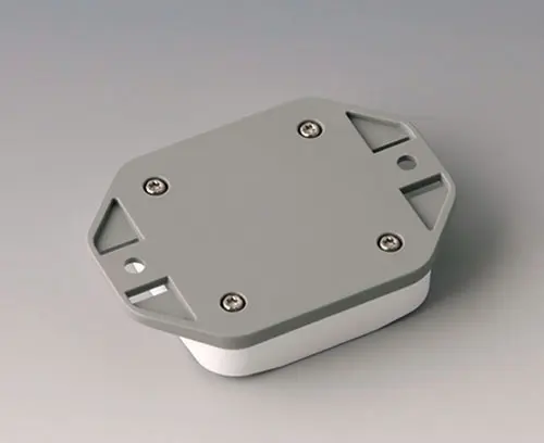 2-part plastic enclosure with flat top part. Bottom part with integrated flanges for fast wall mounting or for mounting on rails and tube profiles or on masts. Robust design with proven tongue and groove connection. Assembled with Torx stainless steel screws. Fixing supports for PCBs and components in the top and bottom parts. Fastening on the supports is by means of hot caulking.