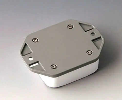 2-part plastic enclosure with high top part. Bottom part with integrated flanges for fast wall mounting or for mounting on rails and tube profiles or on masts. Robust design with proven tongue and groove connection. Assembled with Torx stainless steel screws. Fixing supports for PCBs and components in the top and bottom parts. Fastening on the supports is by means of hot caulking.