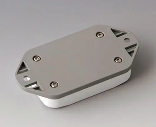 2-part plastic enclosure with flat top part. Bottom part with integrated flanges for fast wall mounting or for mounting on rails and tube profiles or on masts. Robust design with proven tongue and groove connection. Assembled with Torx stainless steel screws. Fixing supports for PCBs and components in the top and bottom parts. Fastening on the supports is by means of hot caulking.