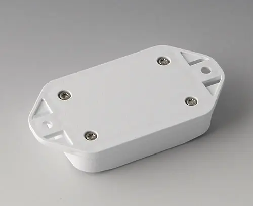 2-part plastic enclosure with flat top part. Bottom part with integrated flanges for fast wall mounting or for mounting on rails and tube profiles or on masts. Robust design with proven tongue and groove connection. Assembled with Torx stainless steel screws. Fixing supports for PCBs and components in the top and bottom parts. Fastening on the supports is by means of hot caulking.