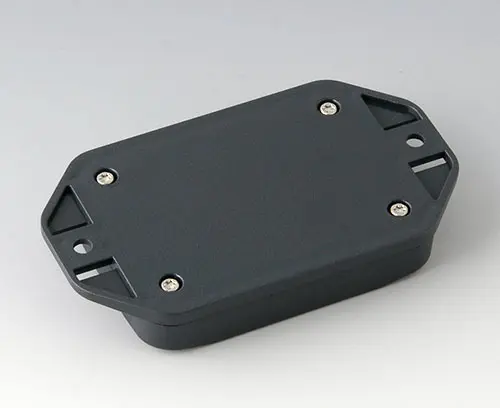2-part plastic enclosure with flat top part. Bottom part with integrated flanges for fast wall mounting or for mounting on rails and tube profiles or on masts. Robust design with proven tongue and groove connection. Assembled with Torx stainless steel screws. Fixing supports for PCBs and components in the top and bottom parts. Fastening on the supports is by means of hot caulking.