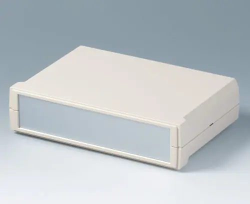 MOTEC M, flat/flat Desk top case with flat base and top part. Screwless mounting of the shells. Front and rear part open. Screw towers for PCBs and vertical guides for mounting panels. Front and rear panels to slide in as accessory.