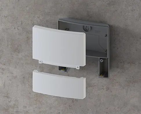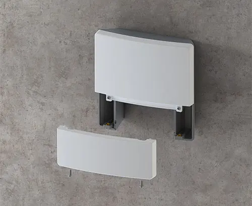 Three-part enclosure with a uniform appearance thanks to concealed screw connections. Modern colour combination of light grey and lava. 2 PCB levels with 4 attachment domes each in the electronics compartment. Can also be used out of doors thanks to the high-quality ASA+PC-FR material.