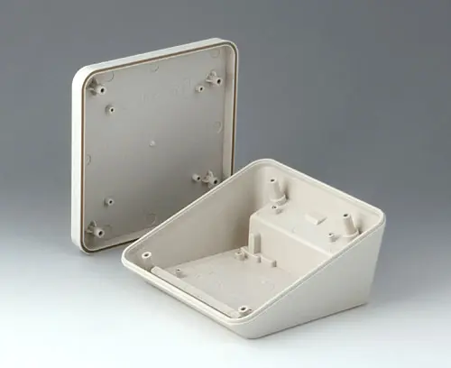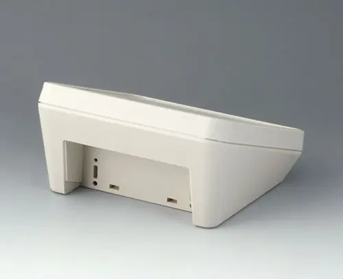 Modern two piece plastic enclosure with an ergonomically inclined operating panel. Fastening pillars for PCBs and components in the top and bottom parts. Recessed interface area. Wall suspension element and sealing (to raise the protection class up to IP 65) included in the range of accessories. Hidden stainless steel assembly screws with secure Torx heads. Can also be used outdoors thanks to the high-quality material and the robust design.