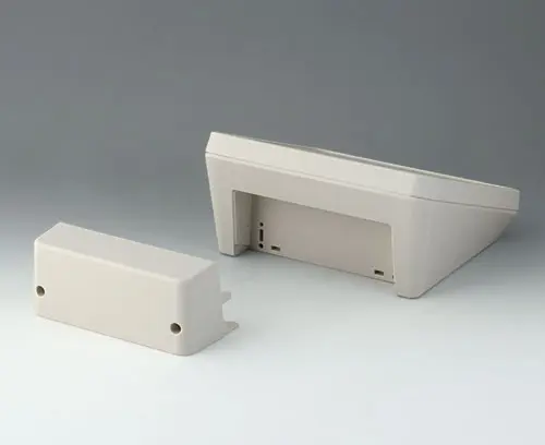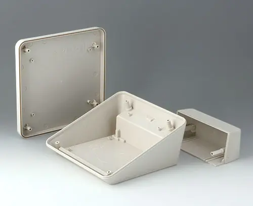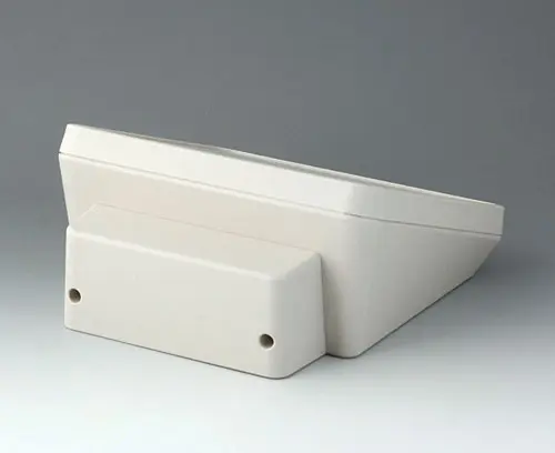 Modern three piece plastic enclosure with an ergonomically inclined operating panel. The deep cover included in the supply provides additional space in a separate area. Fastening pillars for PCBs and components in the top and bottom parts. Wall suspension element and sealing (to raise the protection class up to IP 65) included in the range of accessories. Hidden stainless steel assembly screws with secure Torx heads. Can also be used outdoors thanks to the high-quality material and the robust design.