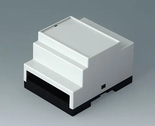 Enclosure for applications where larger components/assemblies need to be fitted inside. Different connection levels flat or high for individual configuration. Case corresponds to DIN 43880, size 1. Simple and quick assembly by locking onto DIN-rails EN 60715 TH35. Base part with fixing pillars for the PCB. Vertical and horizontal guides for additional PCBs.