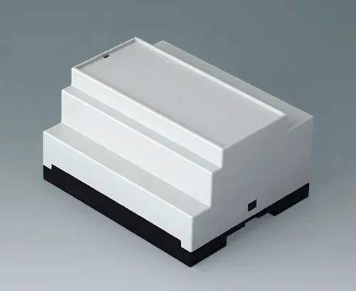 Enclosure for applications where larger components/assemblies need to be fitted inside. Different connection levels flat or high for individual configuration. Case corresponds to DIN 43880, size 1. Simple and quick assembly by locking onto DIN-rails EN 60715 TH35. Base part with fixing pillars for the PCB. Vertical and horizontal guides for additional PCBs.