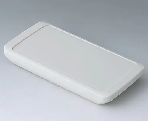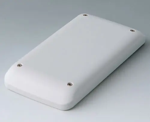 2-piece handheld enclosure, flat design, with a large operating panel of up to 4" (10 cm). The contours of the enclosure are rounded along the sides - comfortable to hold and easy to operate. Recessed operating panel for applications with decorative product labels. Fastening pillars for mounting PCBs in top and bottom parts. Seal for protection class IP 65 available as accessory.