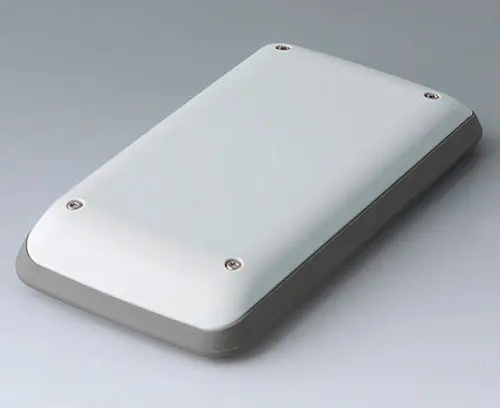 3-piece handheld enclosure with TPE intermediate ring, compact design, with a large operating panel of up to 4" (10 cm). Comfortable grip thanks to enclosure contours that are rounded along the sides and intermediate ring made of TPE, which also serves as impact protection and as a sealing ring for protection class IP 54. Recessed operating panel for using a contoured transparent front screen (available as an accessory with adhesive film) or for protecting individual membrane keyboards. Fastening pillars for mounting PCBs in top and bottom parts.