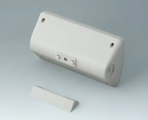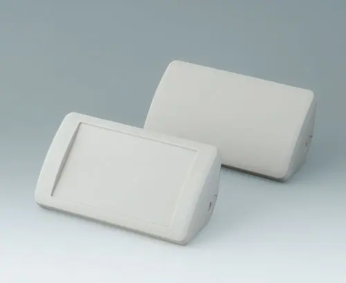 SMART-CONTROL S, Vers. I Two-part plastic enclosure with convex, curved top part. The basic triangular shape allows it to be used in corners or at an ergonomically favourable angle of 45°. Robust design with proven tongue and groove assembly. Case assembled with Torx drive stainless steel screws. Protection class IP 40 without optional sealing kit. Fastening pillars for PCBs and components in the top and bottom parts.