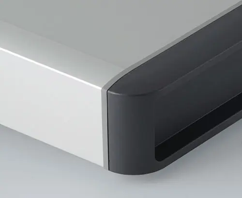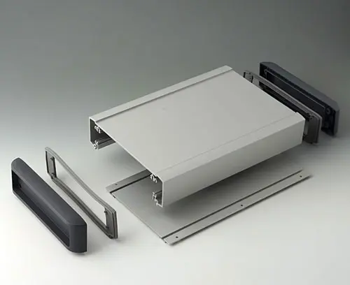 Horizontal guides and screw channels provided inside the case for fitting PCBs. Flat areas for easy installation of interfaces. Recessed area in the top for the protection of displays, membrane keypads and operating elements. Side covers with recessed area for protecting cables and connectors.