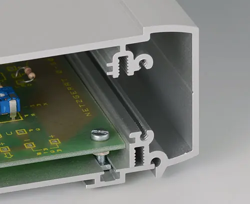 Horizontal guides and screw channels provided inside the case for fitting PCBs. Flat areas for easy installation of interfaces. Recessed area in the top for the protection of displays, membrane keypads and operating elements.