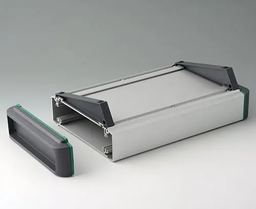 Horizontal guides and screw channels provided inside the case for fitting PCBs. Flat areas for easy installation of interfaces. Recessed area in the top for the protection of displays, membrane keypads and operating elements. Side covers with recessed area for protecting cables and connectors.