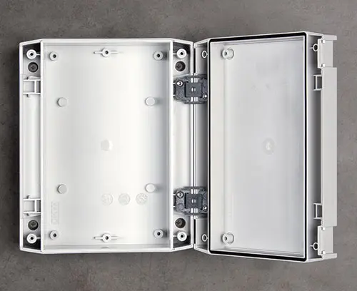 Fastening pillars for PCBs or mounting plates in the bottom and top parts. Bottom part also with two pillars with a supporting surface for mounting a DIN rail.