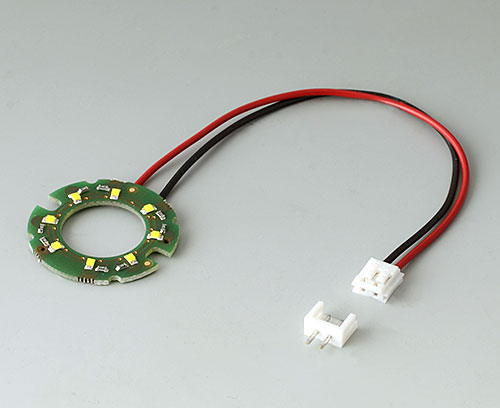 PCB D = 27 mm with 8 LEDs (white light), SMD-technology, connecting cable 120 mm long, 2-pin connector at the end, incl. PCB connector. Universally applicable for knob sizes 33 and 41 mm.