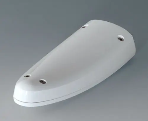 Two-piece hand-held enclosure with an ergonomic, robust design and a pleasant touch sensation. Offers protection up to IP 65 with sealing (accessory). Protection class IP 40 without sealing. Attachment pillars for PCBs and components in the top and bottom parts.
