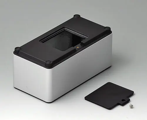 4-part enclosure for many different applications. Sturdy frame made of aluminium, glass bead-blasted and anodised. Plastic parts made of ASA+PC-FR with good UV resistance and high flame resistance. Attachment domes for PCBs and components in the top and bottom parts. Top part with recessed surface to protect the membrane keyboard. Bottom part with opening and screw-down cover: practical for the use of a battery compartment or for access to the interior, e.g. for a memory card or batteries that are mounted directly on the PCB. Battery compartment kit 3 x AA with contact springs, battery clips, button cell holder and wall mounting option as accessories.