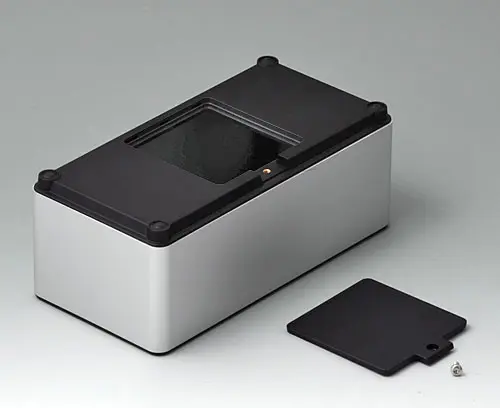 4-part enclosure for many different applications. Sturdy frame made of aluminium, glass bead-blasted and anodised. Plastic parts made of ASA+PC-FR with good UV resistance and high flame resistance. Attachment domes for PCBs and components in the top and bottom parts. Top part with recessed surface to protect the membrane keyboard. Bottom part with opening and screw-down cover: practical for the use of a battery compartment or for access to the interior, e.g. for a memory card or batteries that are mounted directly on the PCB. Battery compartment kit 4 x AA with contact springs, battery clips, button cell holder and wall mounting option as accessories.
