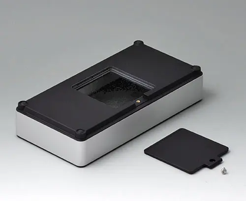 4-part enclosure for many different applications. Sturdy frame made of aluminium, glass bead-blasted and anodised. Plastic parts made of ASA+PC-FR with good UV resistance and high flame resistance. Attachment domes for PCBs and components in the top and bottom parts. Top part with recessed surface to protect the membrane keyboard. Bottom part with opening and screw-down cover: practical for the use of a battery compartment or for access to the interior, e.g. for a memory card or batteries that are mounted directly on the PCB. Battery compartment kit 4 x AA with contact springs, battery clips, button cell holder and wall mounting option as accessories.