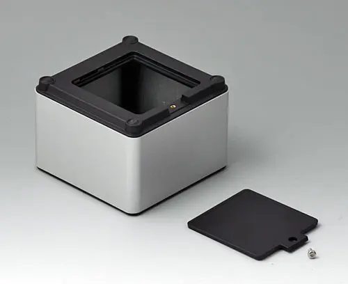 4-part enclosure for many different applications. Sturdy frame made of aluminium, glass bead-blasted and anodised. Plastic parts made of ASA+PC-FR with good UV resistance and high flame resistance. Attachment domes for PCBs and components in the top and bottom parts. Top part with recessed surface to protect the membrane keyboard. Bottom part with opening and screw-down cover: practical for the use of a battery compartment or for access to the interior, e.g. for a memory card or batteries that are mounted directly on the PCB. Battery compartment kit 4 x AA with contact springs, battery clips, button cell holder and wall mounting option as accessories.