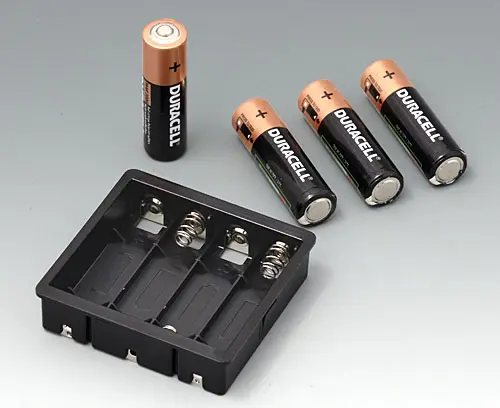 For 4 x 1.5 V mignon-cells (AA). To install a PCB above the battery compartment in the bottom part, the extender (EZ031209) is required.