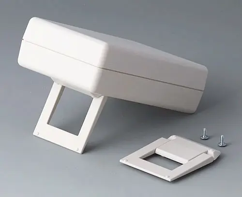 HAND-HELD-BOX P, Vers. I Design: Successfully used case for measuring instruments. With recessed area for imprintings or your logo. Cut-out section for LCD or analogical modules. With battery compartment, accessible from the outside, for 9 V flat battery (PP3) or 1.5 V baby cell (C) with contacts for soldering. Raised front area to accommodate plugs.